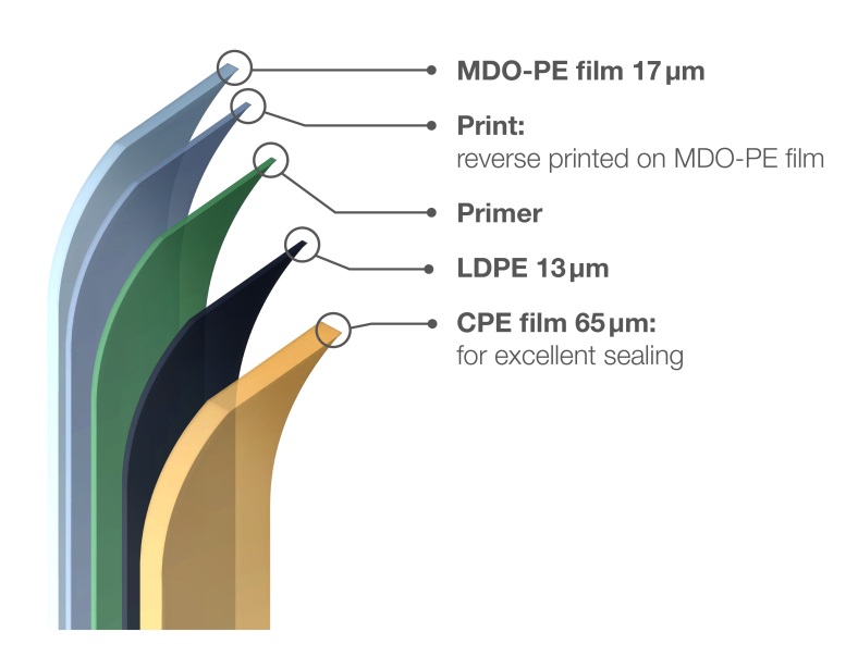 17 µm MDO-PE 薄膜和 65 µm CPE 密封膜在最先進的 FlexPack 塗層和貼合的生產線上進行進一步加工和塗層。反向印刷的 MDO-PE 薄膜需要極少量的底漆來提高附著力。然而,為了黏合兩種不同性能的薄膜,在擠出過程中僅使用PE,而沒有使用任何其他黏合劑。透過這種方式,保留了所有基材的單一材料特性,並保證了最佳的可回收性。