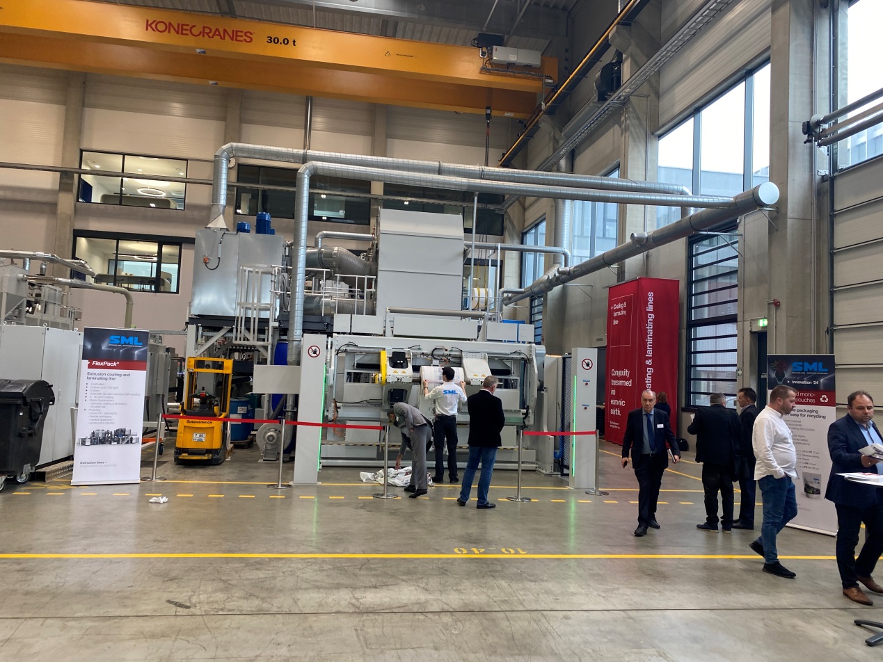 為了展示 SML 擠出生產線的巨大潛力,在 2024 年 10 月 9 日至 10 日的 SML 創新日上現場製造了用於單一材質站立袋的 PE 薄膜並進行貼合和塗層生產線運作。